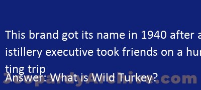 Below you will find the solution for: This brand got its name in 1940 after a distillery executive took friends on a hunting trip Jeopardy .